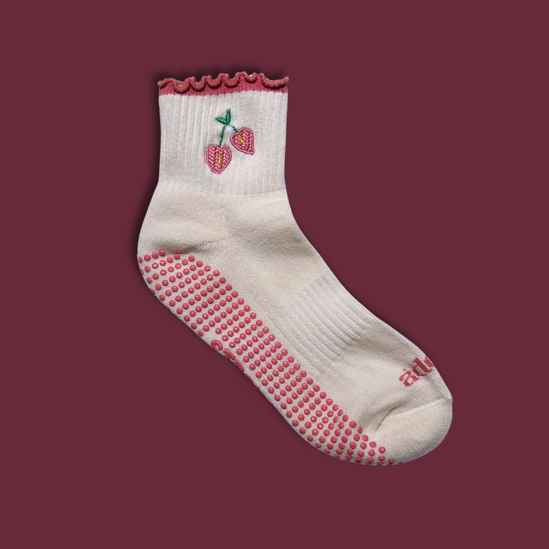 With its cherry-anthurium embroidered ankle design, this sock merges studio efficiency with stylish street appeal; these socks are a must-have in and out of the studio.
