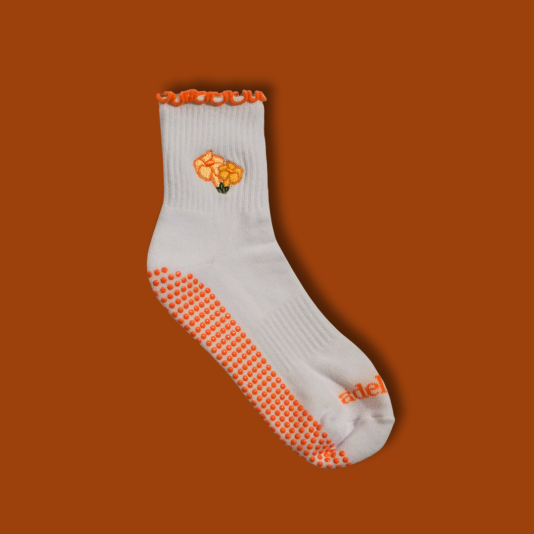Celebrate your love for puakenikeni with our Kenikeni design. Featuring delicate embroidered blooms and a playful orange ruffle, this design pays homage to the flower’s tropical charm and vibrant energy. Perfect for adding a cheerful pop of color to your Pilates or Lagree routine.